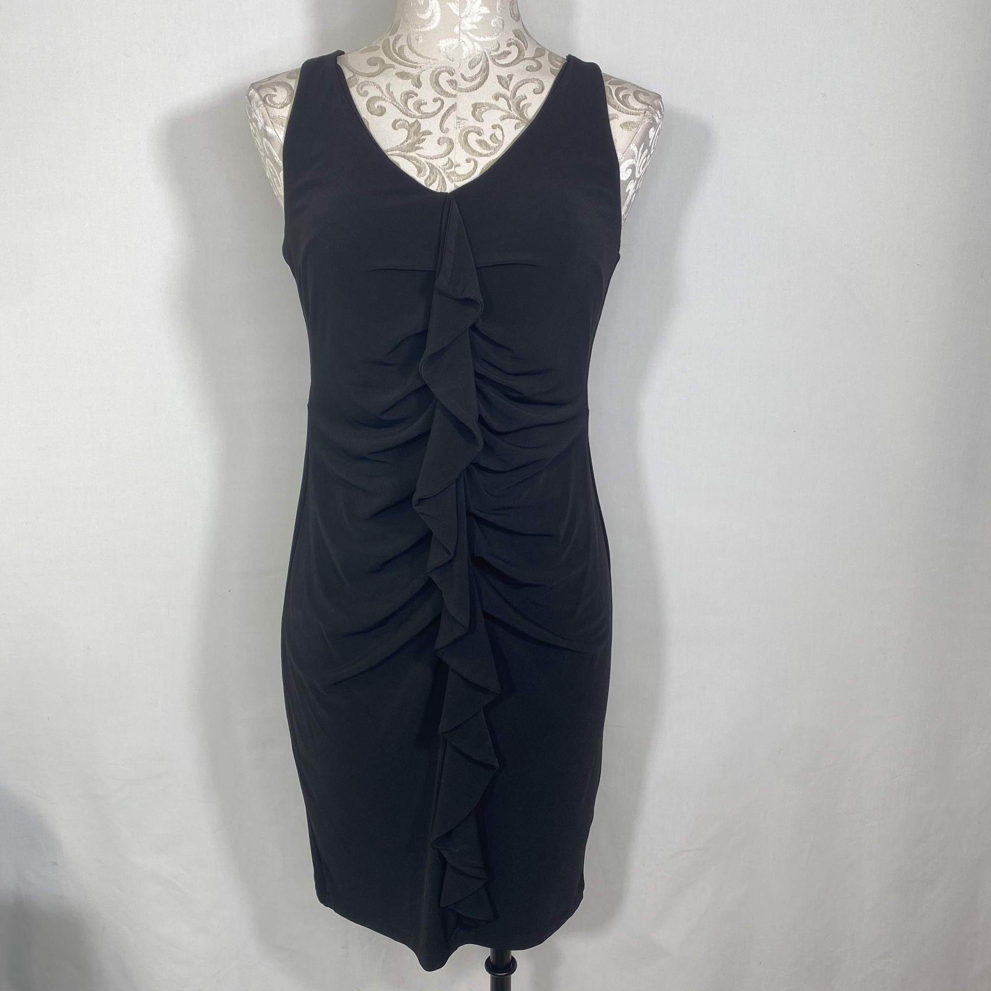 100-0129 Valerie Bertinel, Black, Size: 8 tight dress with ruffle down the center 95% polyester 5% spandex Good Condition