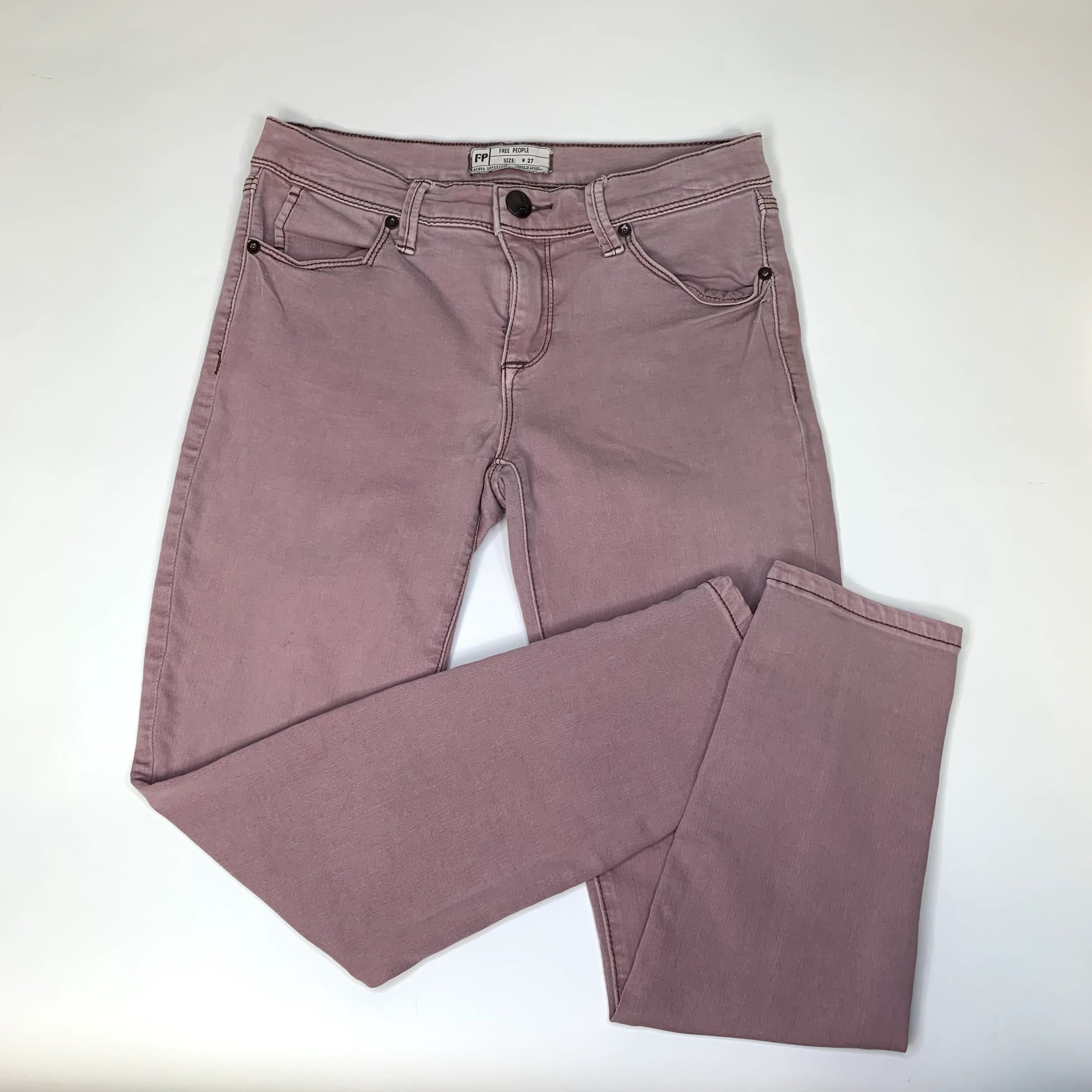 100-804 Free People, Pink, Size: 27 pink jeans with rips 53% cotton 23% rayon 22% polyester 2% spandex good