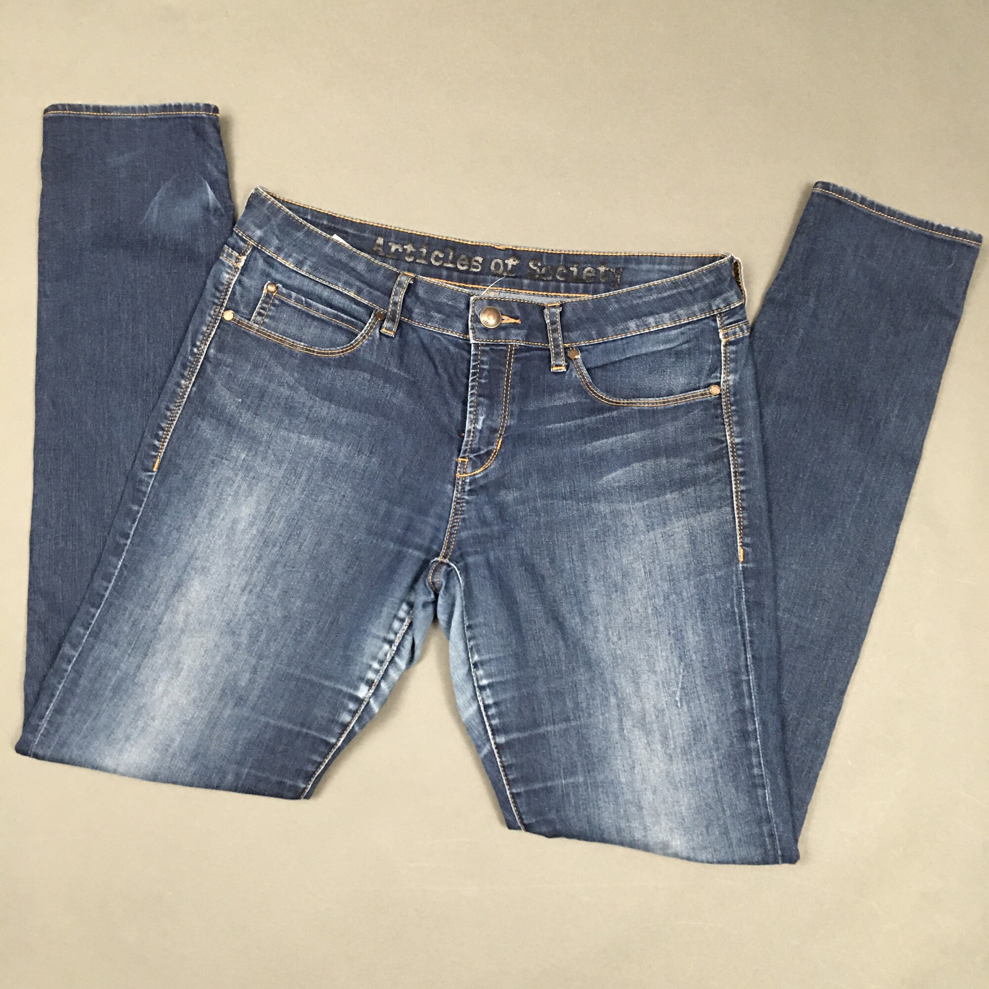 102-310 Articles Of Society, Blue, Size: 28 back left side has small distress. Nicely worn soft denim. 77% cotton, 21% polyester, 2% spandex