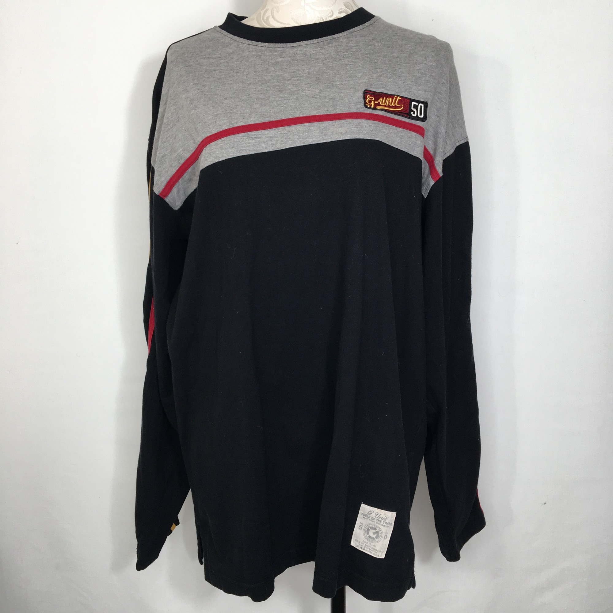 120-395 G Unit, Black, Size: XL long sleeve black and grey shirt with yellow and red stripes on sleeves 100% cotton good