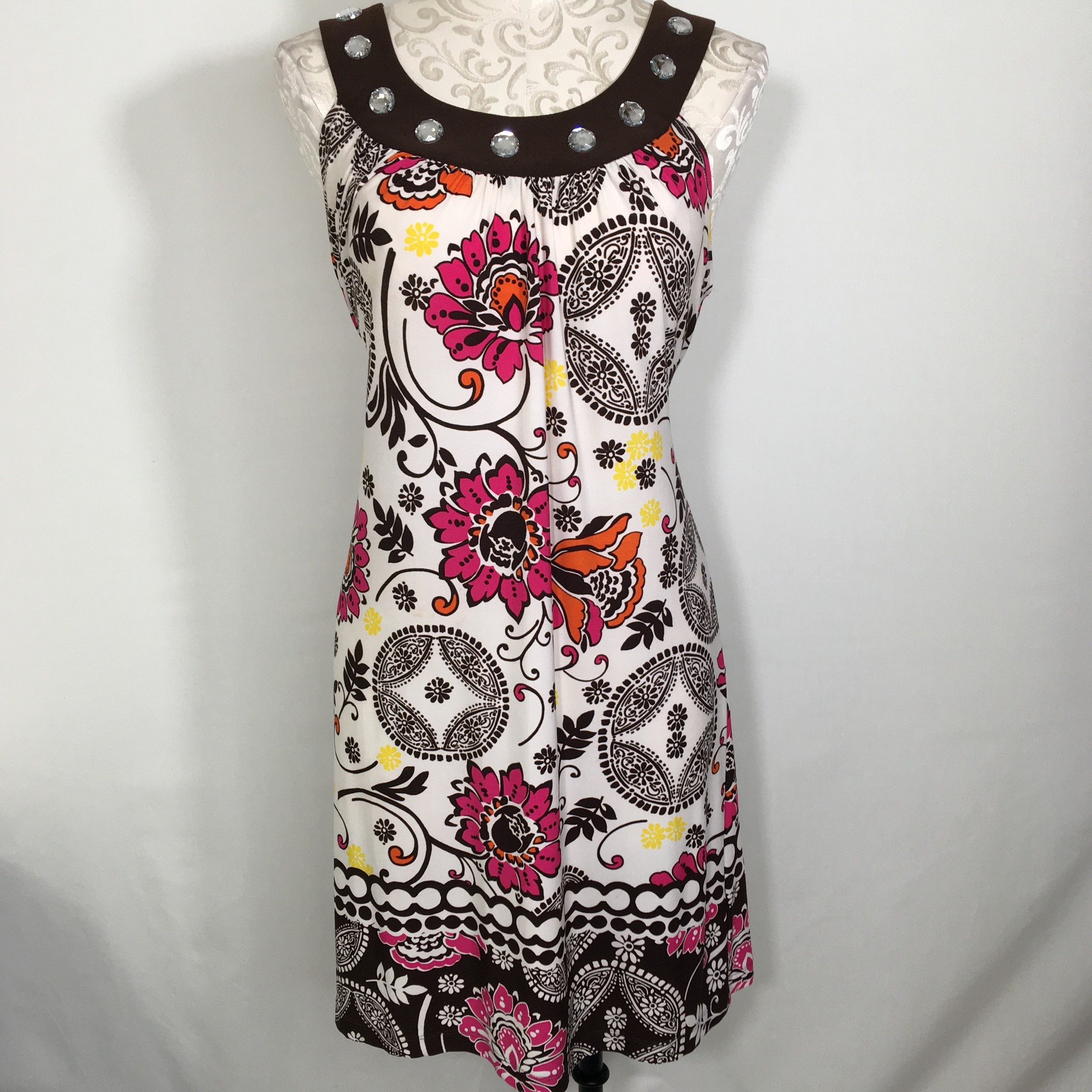 120-454 Candie's, Multicol, Size: Small brown haletr dress with gems and pink orange and yellow floral pattern 95% polyester 5% spandex good