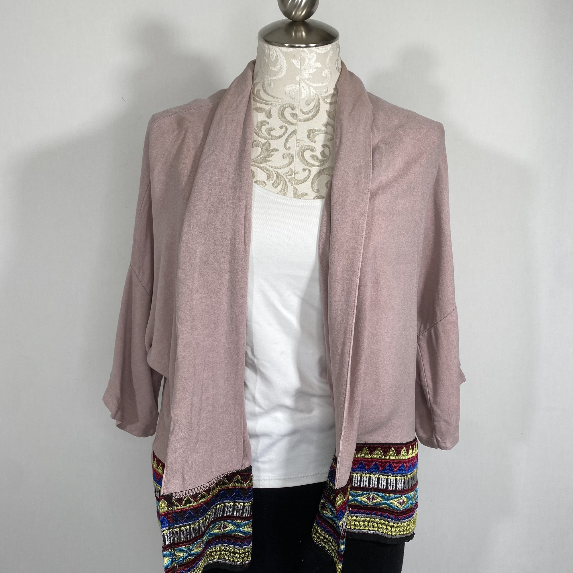120-470 Short Sleeve, Pink, Size: 10 light pink short sleeve cardigan with rainbow embroidary at the bottom 20% cotton 80% viscose good