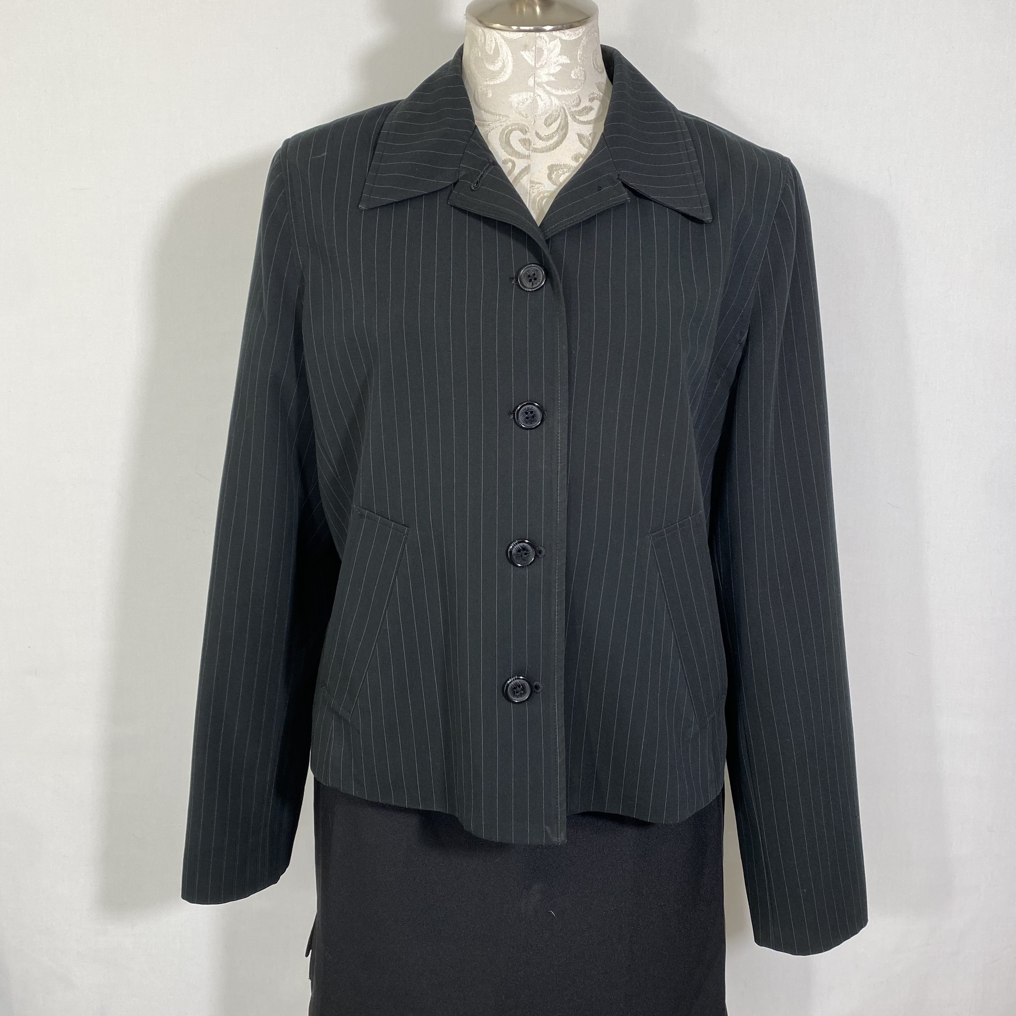 120-474 Isaac Mizrahi, Black, Size: Large black blazer with thin grey stripes and 3 buttons 75% polyester 20% rayon 5% spandex good