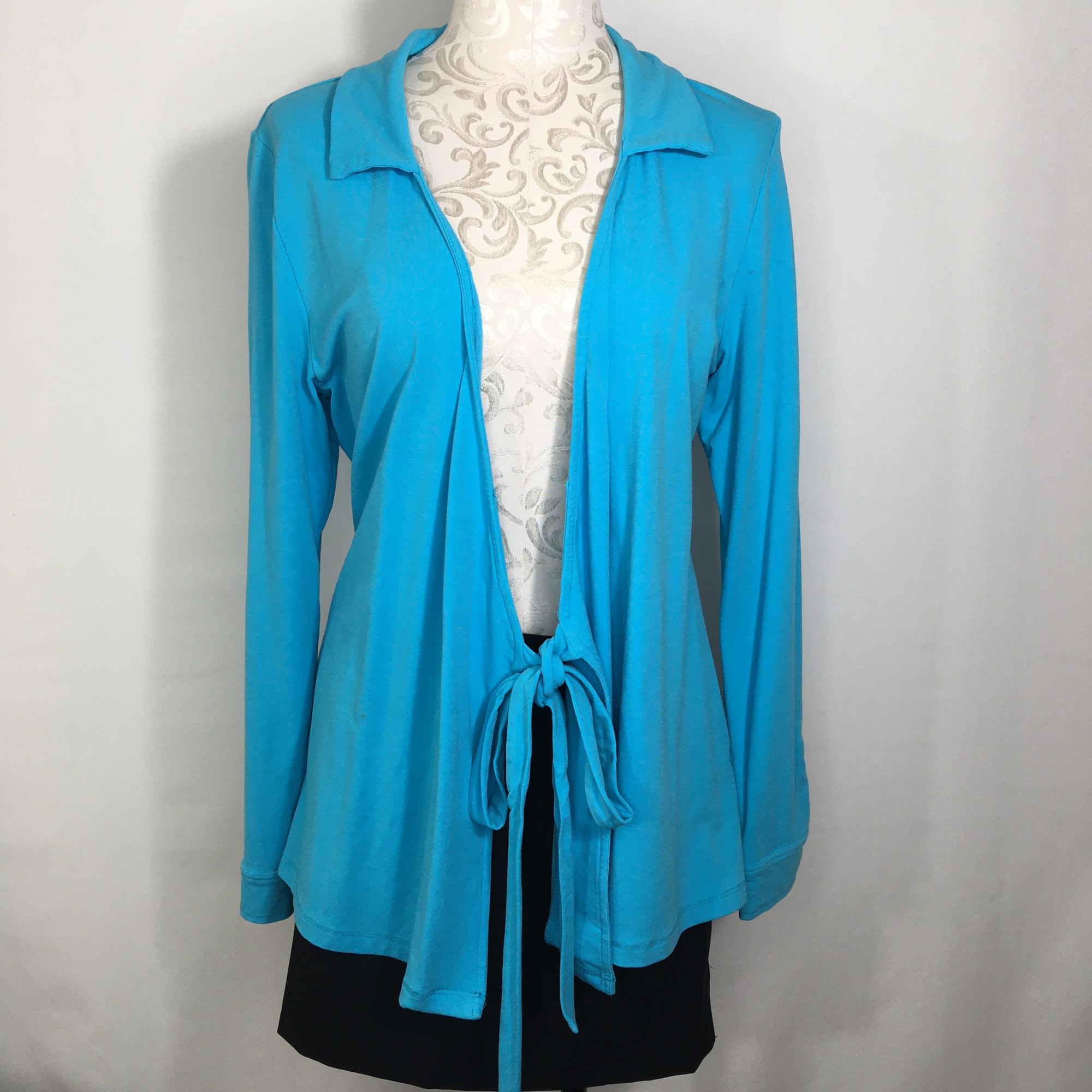 120-476 Fresh Produce, Blue, Size: Large blue caridgan with ties in the middle 71% rayon 19% nylon 10% lycra good
