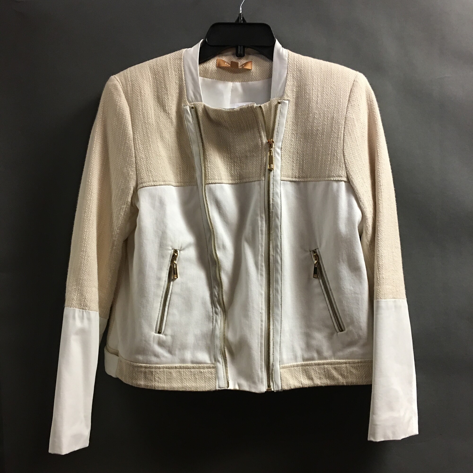 two tone tweed denim and faux leather trim motorcycle style jacket. Dry Clean only – cotton spandex/ polyester, polyurethane.