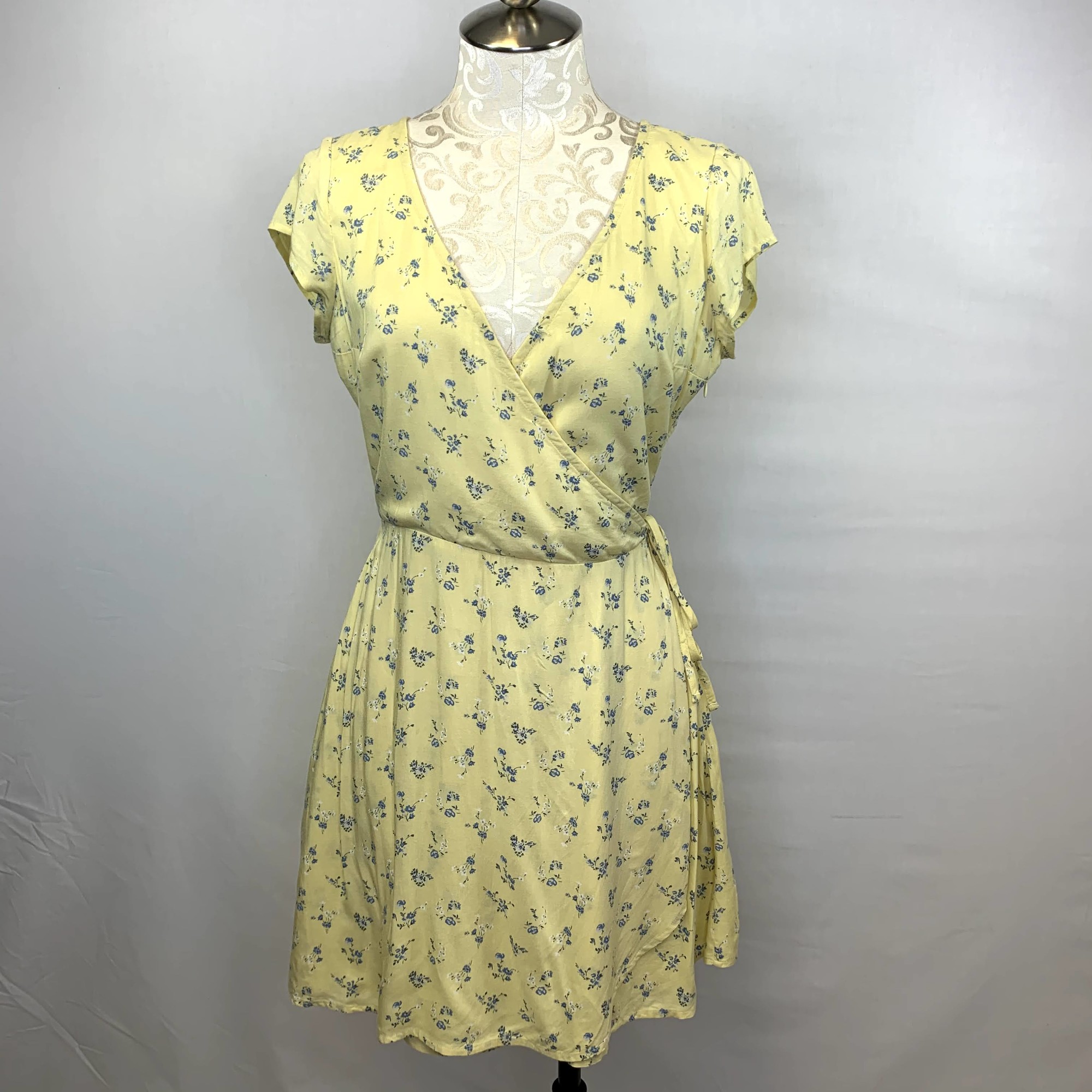 yellow wrap dress with blue flowers 100% viscose good condition