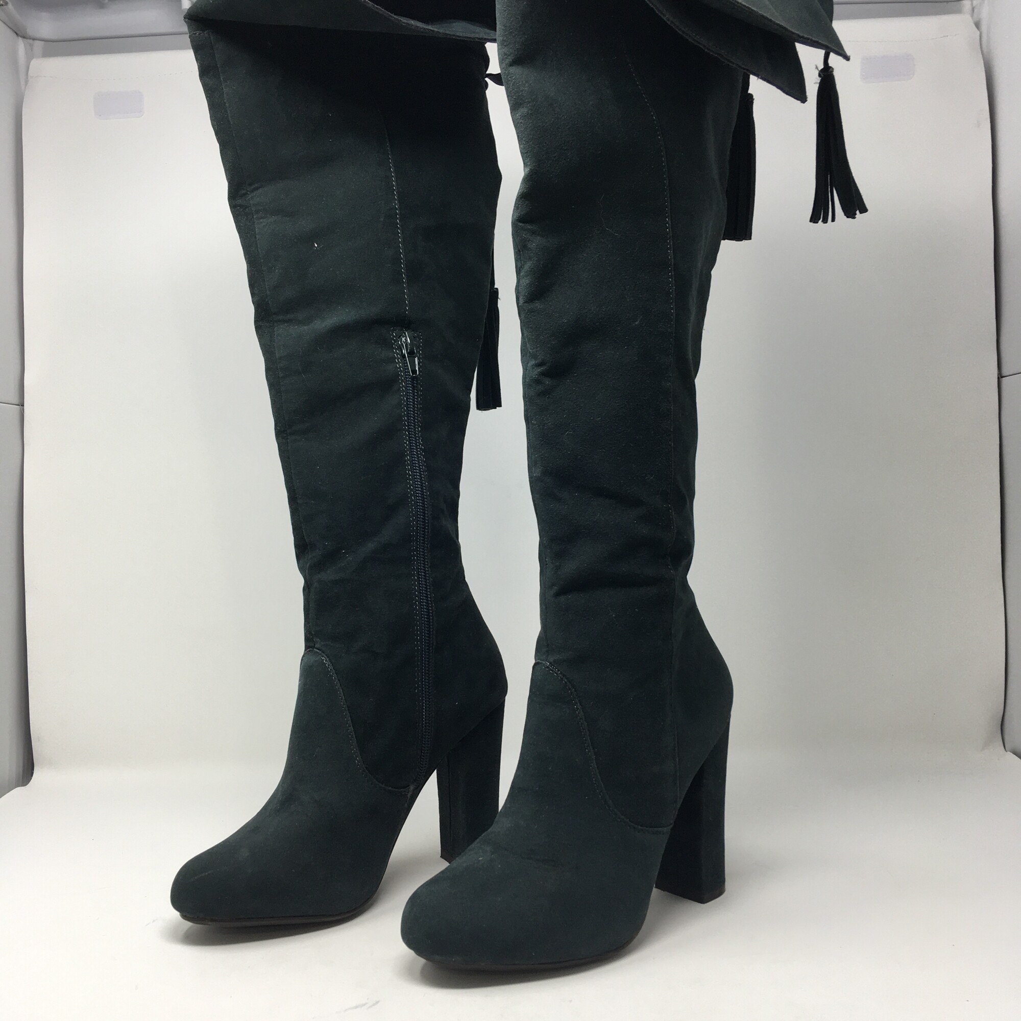 Thigh-high boot features a cute tassel accent in the back and a narrow block heel for comfort. Vegan Faux-suede textile, Forest Greeen,