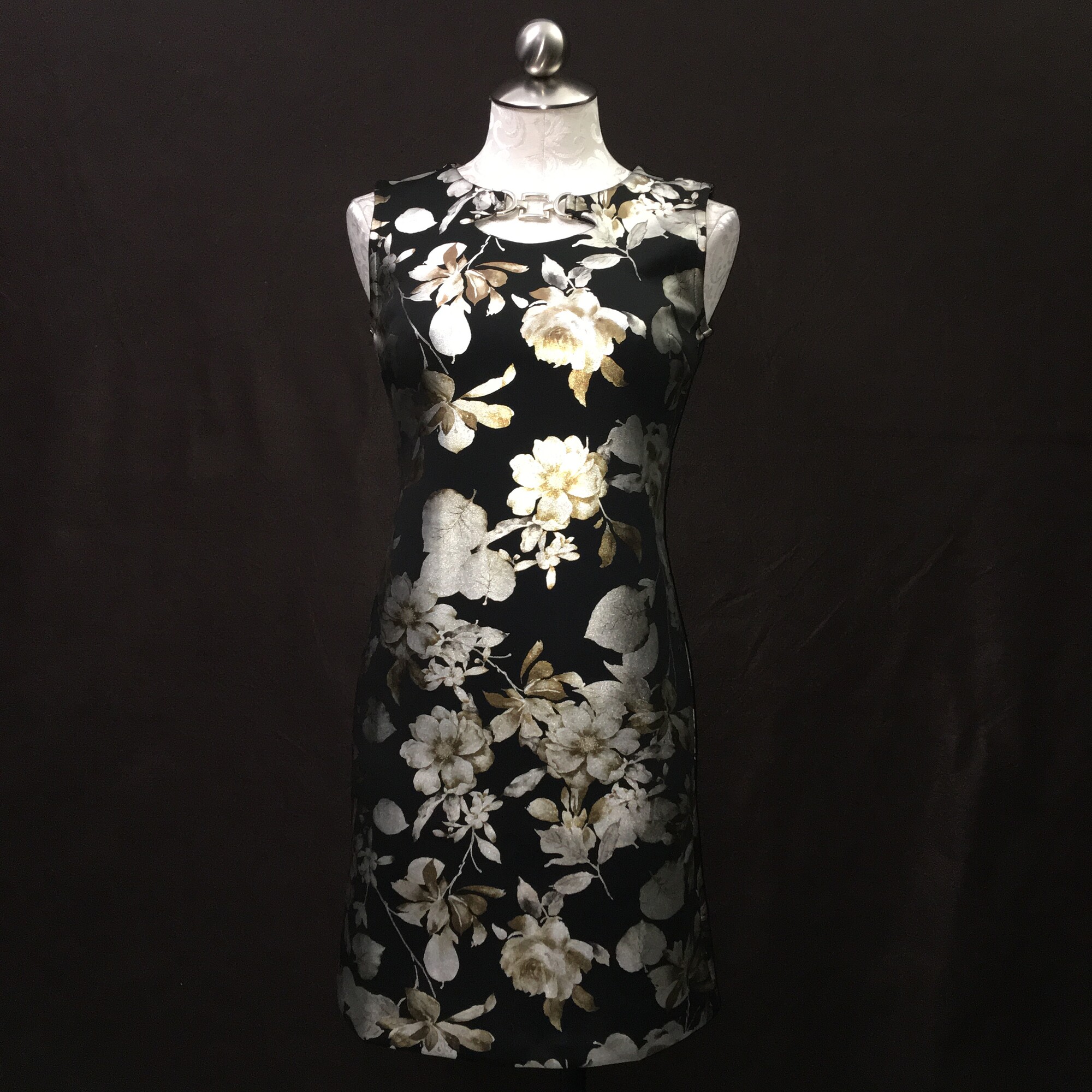 New With Tags. Black with silver and copper large metalic floral pattern. Nekline has modern silver hardware, hidden back zipper.