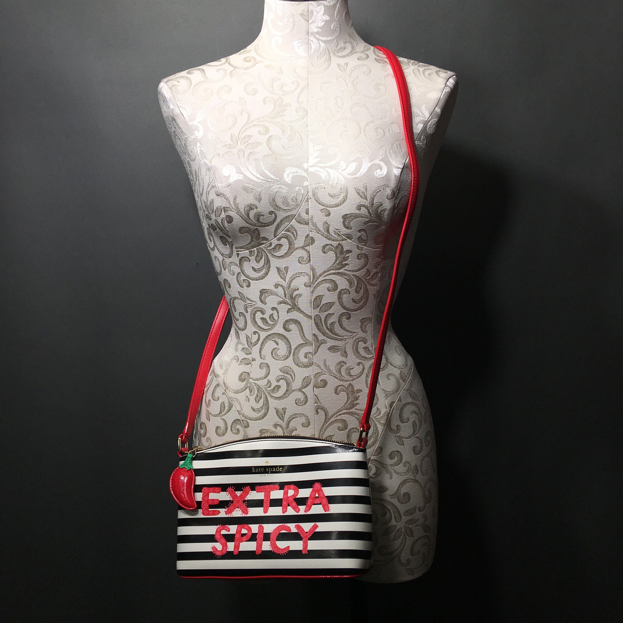 Kate Spade Extra Spicy, Crossbody bag, Black and white Stripe, Size: Small. Top zipper has cute patent leather chilli pepper attachment, dustbag included. Lightweight, Adjustable Strap, Cross-Body Strap, Lined, Pockets, Bag Charm, Inner Pockets