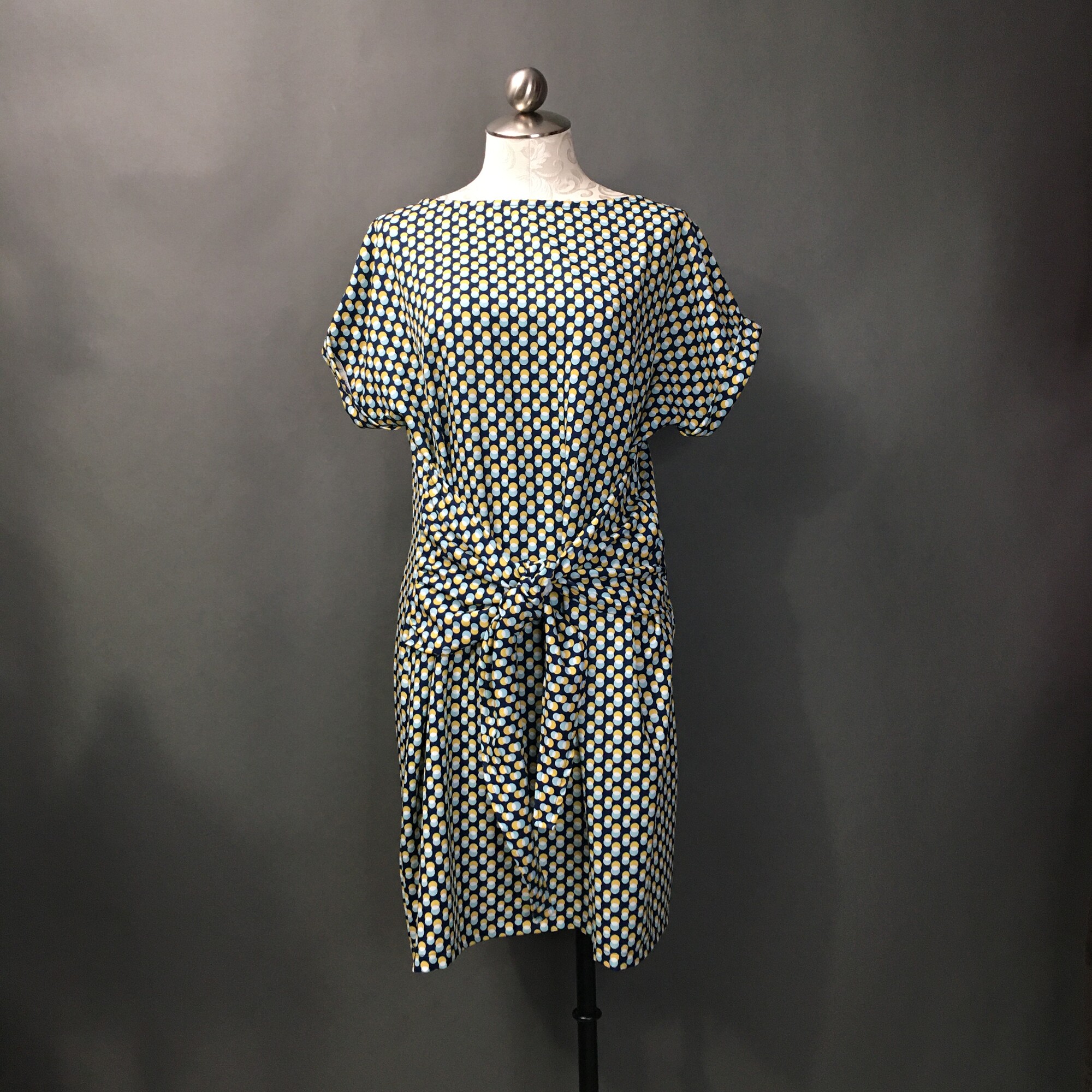 Laura Estrada, Pattern, Size: M. Laura Estrada, Pattern, Size: M sleeveless ,55% polyester / 45% rayon short cuffed sleeves,round collar shift that ties in front. Polka dot print in ochre,teal,navy and white. This is a light pull over, cute round neck unlined dress. This dress falls just below the knees (pending height), and is a probable fit for size 6. Please see the measurements. There are no material tags. Great fun travel dress! Columbian designer Laura Estrada is exclusive to L'Unique Boutique in CT. This dress is one of a kind!