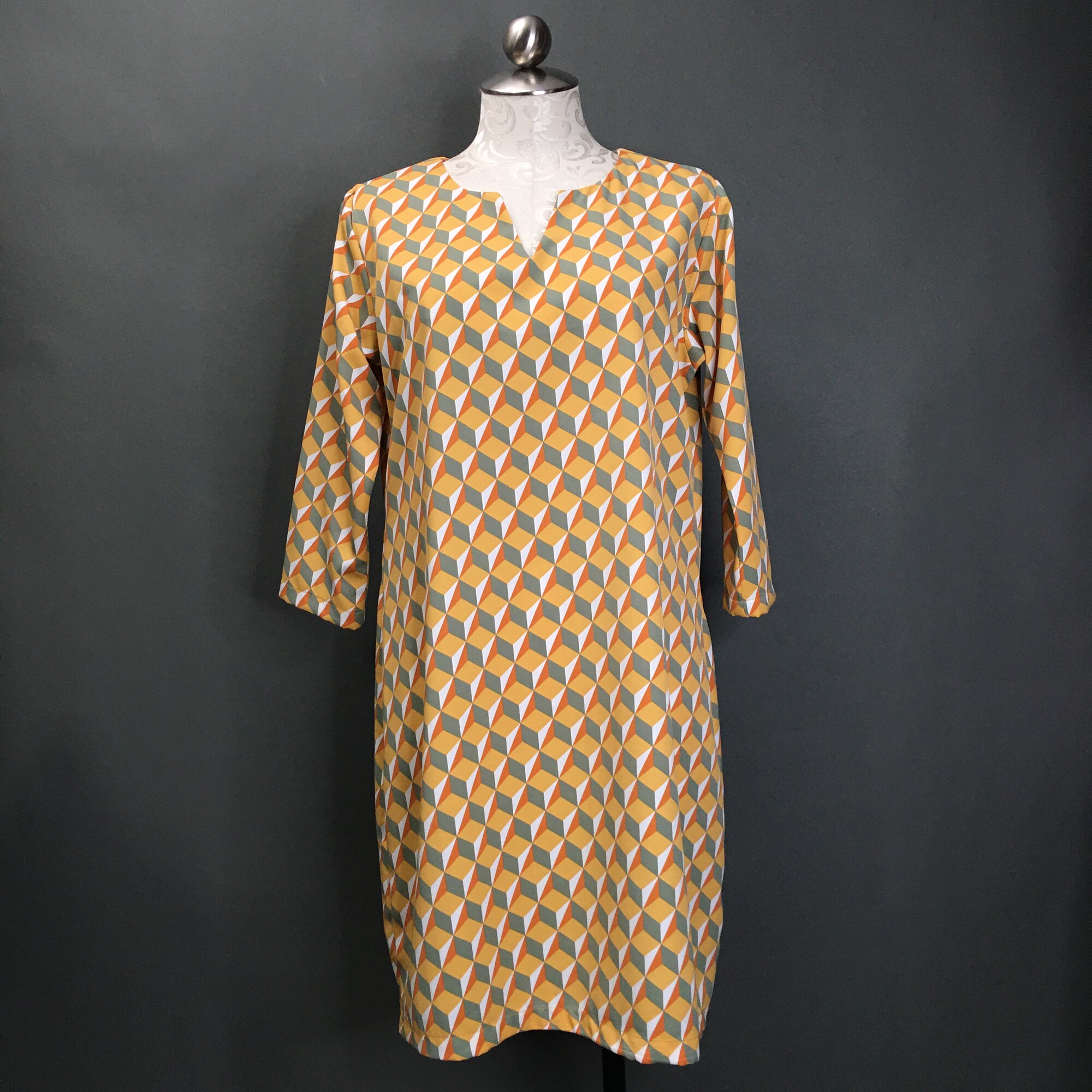 Laura Estrada, Pattern, Size: M. Laura Estrada, Pattern, Size: M sleeveless ,55% polyester / 45% rayon round neck .Geometric pattern print inmustard, light grey,, brown and black. This is a light pull over, cute unlined dress. This dress falls just on the knees (pending height), and is a probable fit for size 8-10. Please see the measurements. There are no material tags. Great fun travel dress! Columbian designer Laura Estrada is exclusive to L'Unique Boutique in CT. This dress is one of a kind!