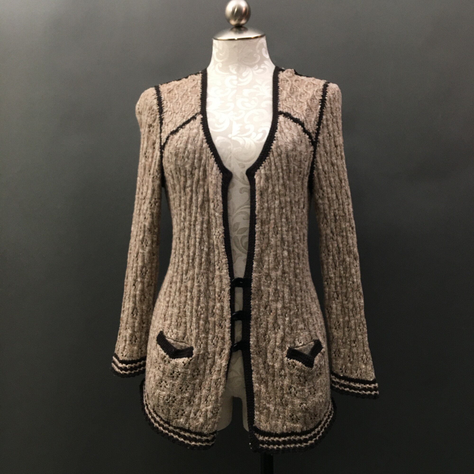 beige open knit patchwork look, long sleeves with brown knit details, 3black jet buttons, black tie in back.