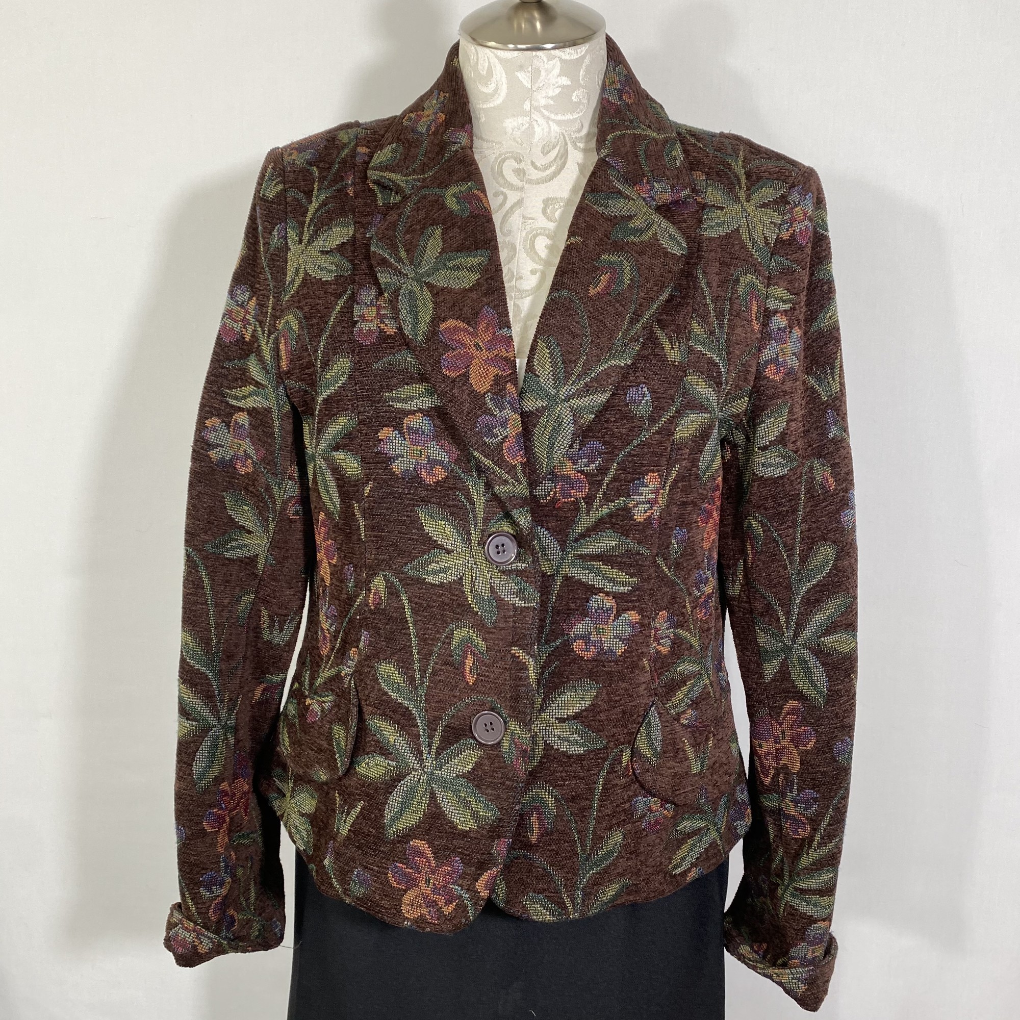 100-620 Stanley Blacker, Brown/mu, Size: 14 petite Brown blazer w/ green palm tree and flower print polyesther/cotton