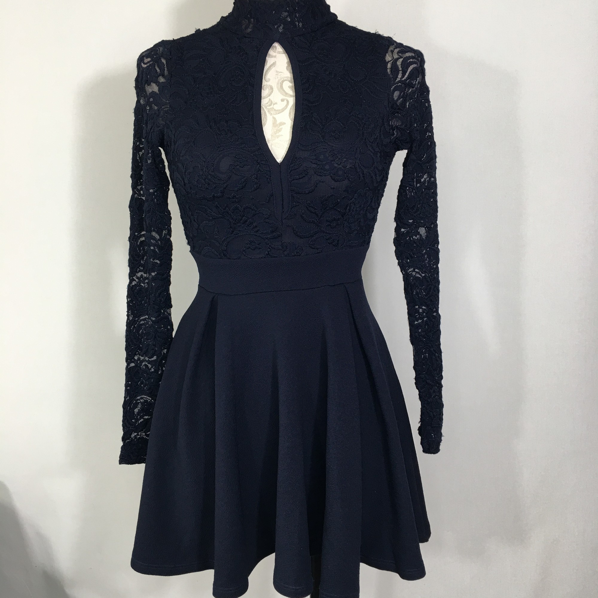 Windsor Lace Skater Dress, Blue, Size: XS long sleeve keyhole dress 60% nylon 38% polyester 2% spandex
